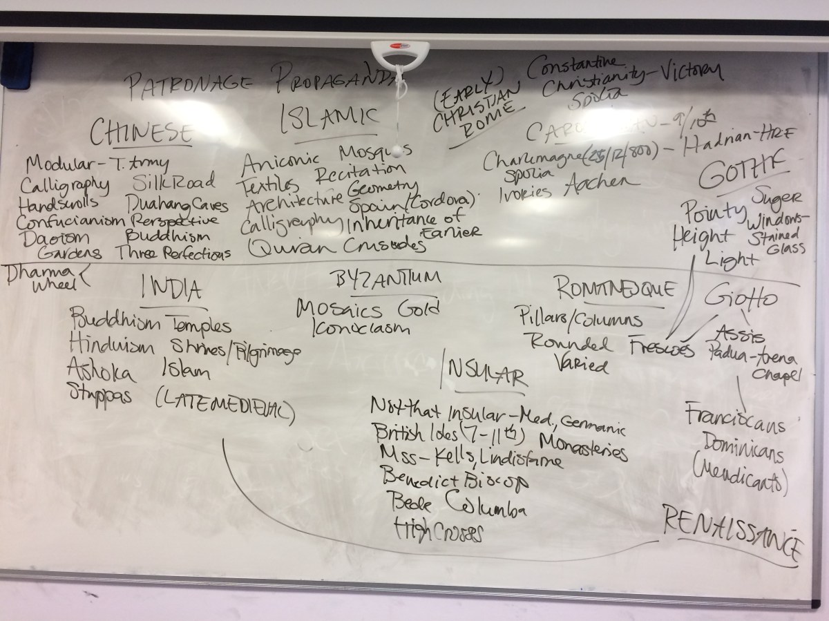 Students worked together to create lists of key words, people, and artworks as part of their revision. The exercise was designed to generate conversation and show students what they remembered from the course – and what they needed to revise.